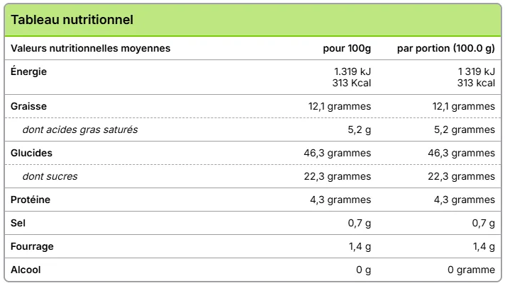 Ingrédients: Farine de riz bio, OEUFS, farine de maïs bio, poudre de cacao, chocolat, beurre de cacao bio, sucre, margarine bio, amidon de maïs, gomme de guar, lait de coco, jus de citron, sucre vanillé, levure chimique bio, sel des Alpes.