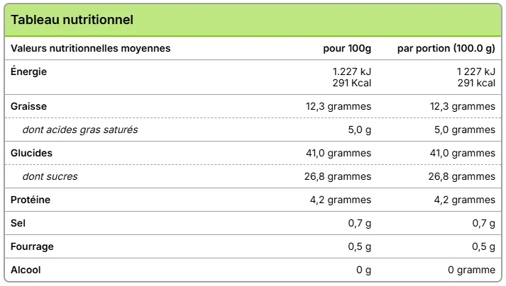 Ingrédients: Farine de riz bio, OEUFS, farine de maïs bio, jus de citron, beurre de cacao bio, sucre, margarine bio, amidon de maïs, gomme de guar, lait de coco, tapioca, sucre vanillé, levure chimique bio, sel des Alpes.