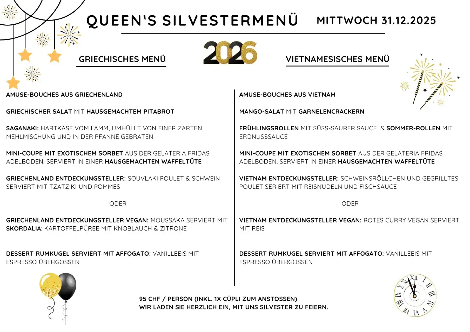 Am Mittwoch, 31. Dezember 2025, laden wir Sie herzlich ein, Silvester in festlicher Atmosphäre mit unserem exklusiven Queen’s Silvestermenü zu feiern.